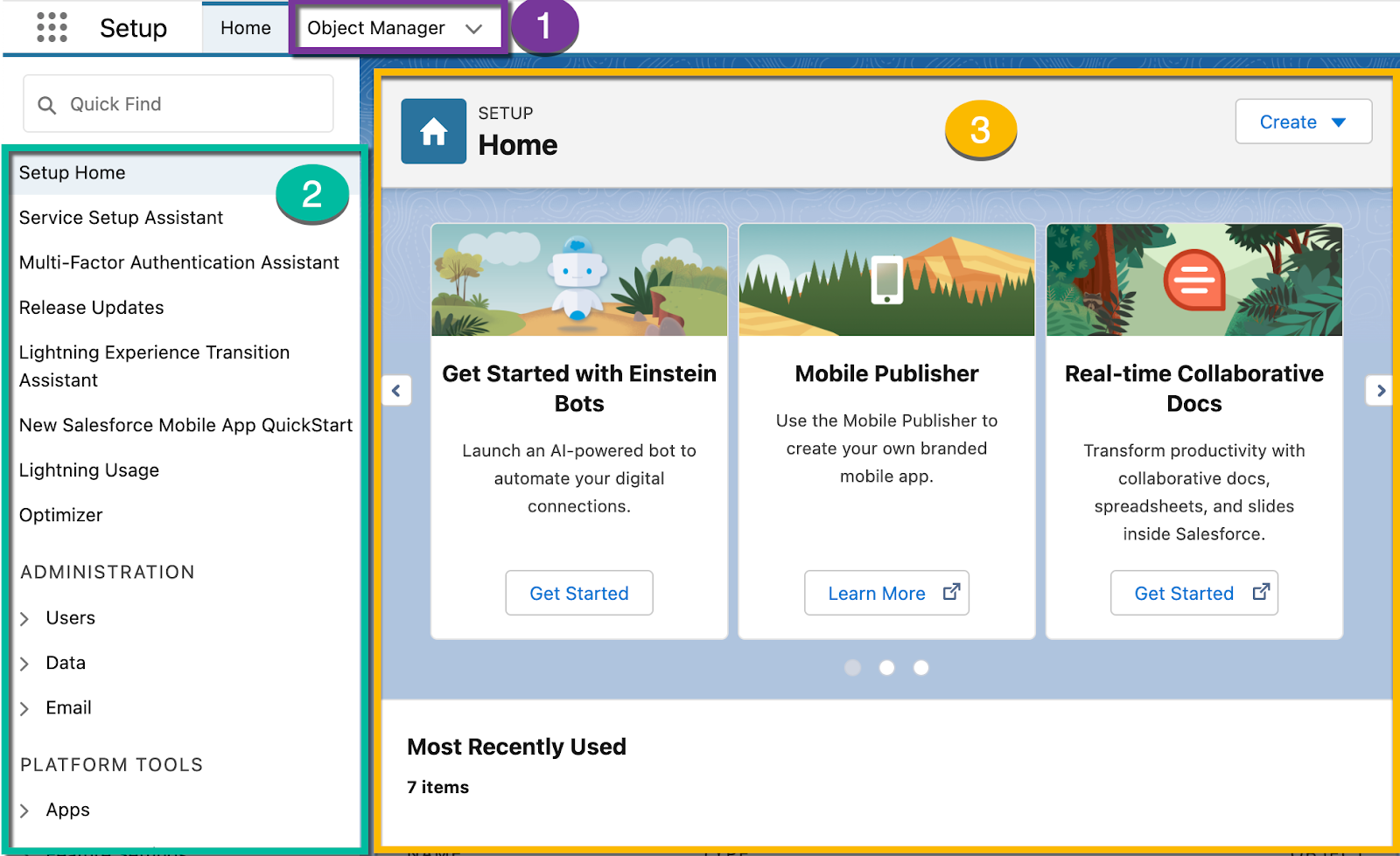 Object Manager: Object Manager is where you can view and customize standard and custom objects in your org.